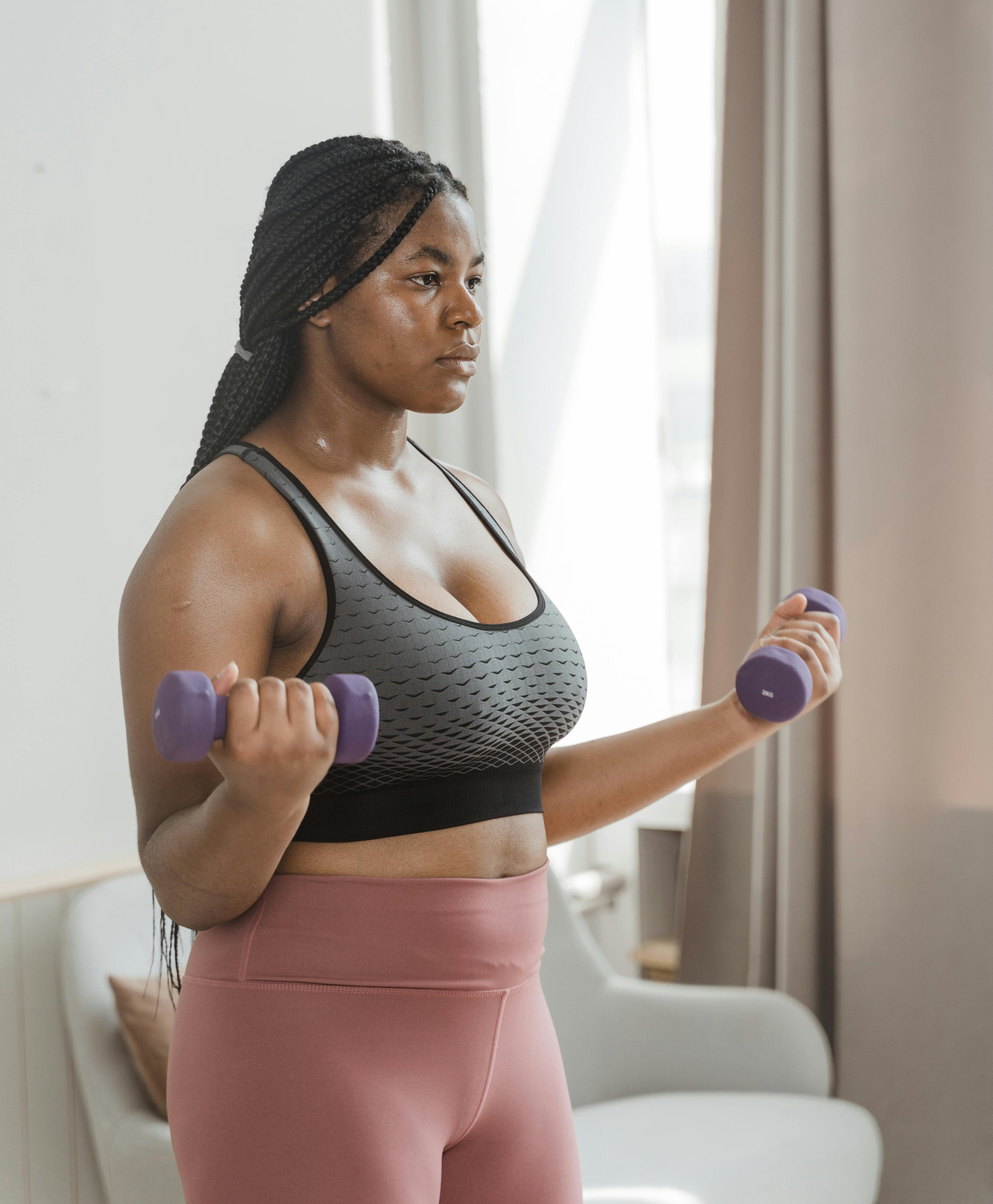 - 숄더 프레스: 어깨 강화운동으로 어깨 높이로 아령을 밀어 올리는 동작입니다.