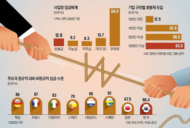 한국 기업 다수가 근속연수 기반의 호봉제를 유지하고 있어 직무급제로의 전환은 상당한 저항에 직면할 것으로 보인다. 1000인 이상 기업의 63%가 여전히 호봉제를 적용 중이며, 정규직·대기업일수록 변화에 소극적인 경향이 강하다. 국정기획 위도 대통령실 보고에서 “연공급 체계에서 동일임금 정책을 추진할 경우 현장 갈등이 확대될 수 있다”는 점을 위험 요소로 명시했다.