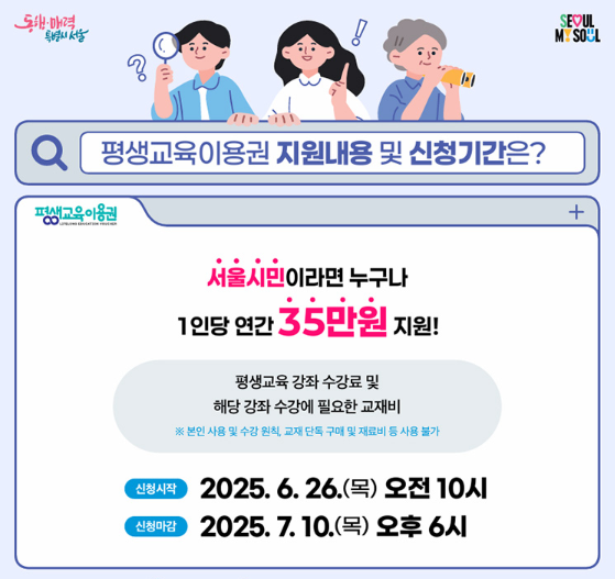 2025 서울시 평생교육이용권, 소득 제한 폐지! 만 19세 이상 누구나 연간 35만 원 지원… 디지털·노인·장애인 유형까지 신청부터 수령·사용처·유의사항까지