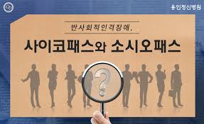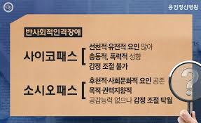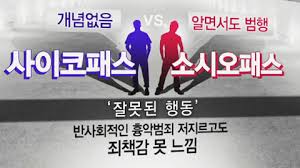 도덕적 구분이 가능하여 행동에 대한 인지는 하나양심적 가책을 느끼지 않는 정신적 장애로 반사회적 인격장애의 일종으로 자신의 성공을 위해서라면 수단과 방법을 가리지 않고 나쁜 짓을 저지르며 나쁜 짓에 대한 가책을 느끼지 못하는 사람을 마하는 것입니다"소시오패스예:종영된 드라마'초적자'에서 배우 김상중이연기했수목드라마던인물김동윤과 SBS수목드라마 '별에서 온 그대'드라마에서 극 중 배우신성록이 연기했던 이재경역을 들 수 있으며, 영화'캐빈을 위하여'나오는 캐빈도 있습니다