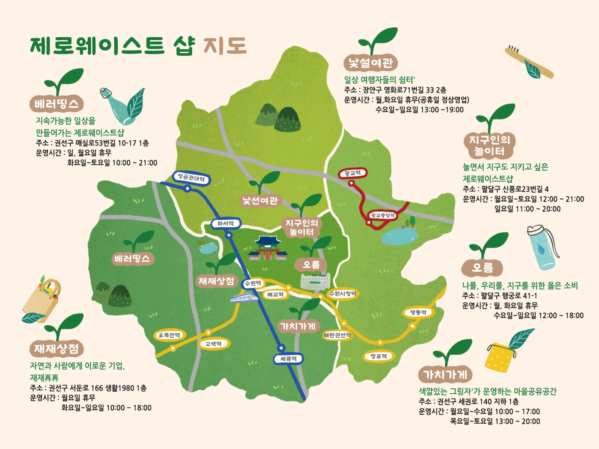 제로웨이스트 상점의 위치, 운영 시간, 판매 품목 등을 확인할 수 있어 편리합니다.