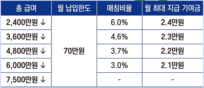 - 정부 기여금 매칭: 소득 구간에 따라 월 납입액의 일정 비율을 정부에서 지원합니다. 예를 들어, 연 소득 2,400만 원 이하인 경우 월 납입액 중 40만 원까지 6%를, 40만 원 초과분에 대해서는 3%를 지원받을 수 있습니다.