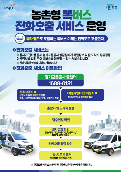 호출은 ‘똑타’ 앱 또는 콜센터(1688-0181)를 통해 가능해 스마트폰 사용이 어려운 분들도 쉽게 이용할 수 있습니다.