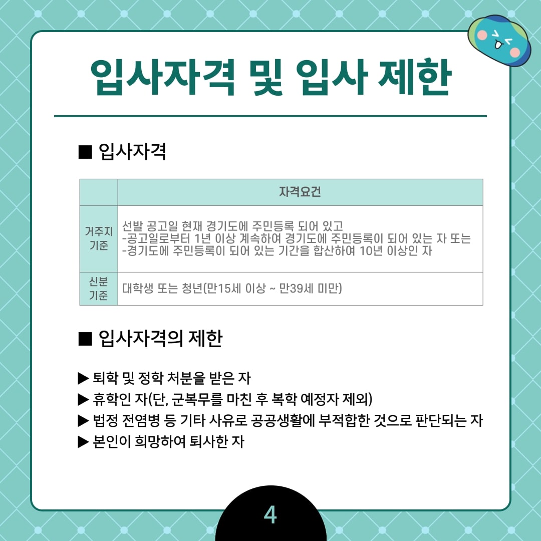 - 지원 자격: 선발 공고일 기준 1년 이상 계속하여 경기도에 주민등록이 되어 있는 대학생 및 청년, 또는 공고일 현재 도에 주민등록이 되어있고, 이전에 도에 주민등록이 되어 있던 기간의 합산이 10년 이상인 대학생 또는 청년