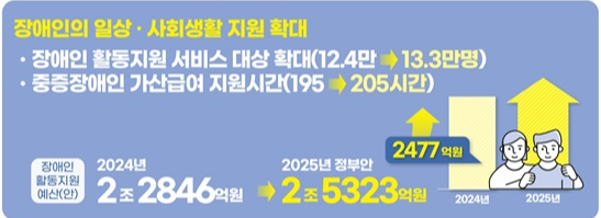 발달장애인과 장애아동을 위한 지원도 확대됩니다: 발달장애인 예산 증액: 발달장애인 지원 예산을 4,030억 원으로 증액하여, 주간활동 서비스와 방과 후 활동 서비스를 강화합니다.