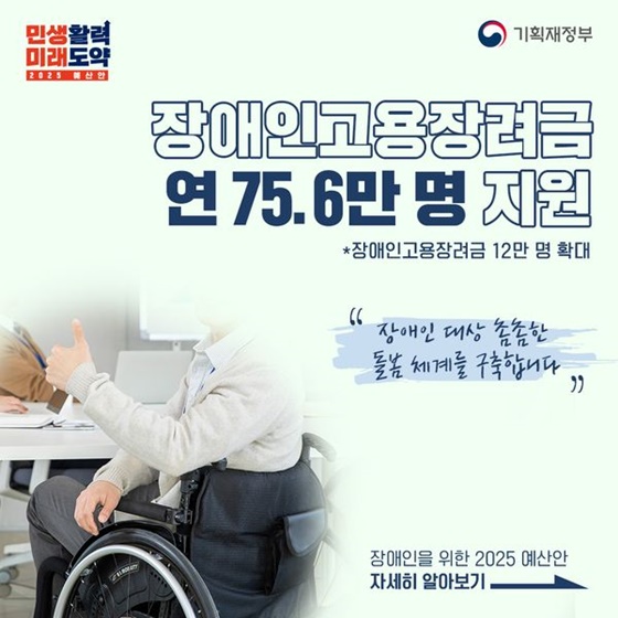 장애인의 경제적 자립을 지원하기 위해 다양한 일자리 정책이 추진됩니다: 장애인 고용장려금 지원 대상 확대: 장애인 고용장려금 지원 대상을 75만 6,000명으로 확대하여, 의무고용률을 초과하여 장애인을 고용한 사업주에게 월 35만 원에서 90만 원의 지원금을 제공합니다.